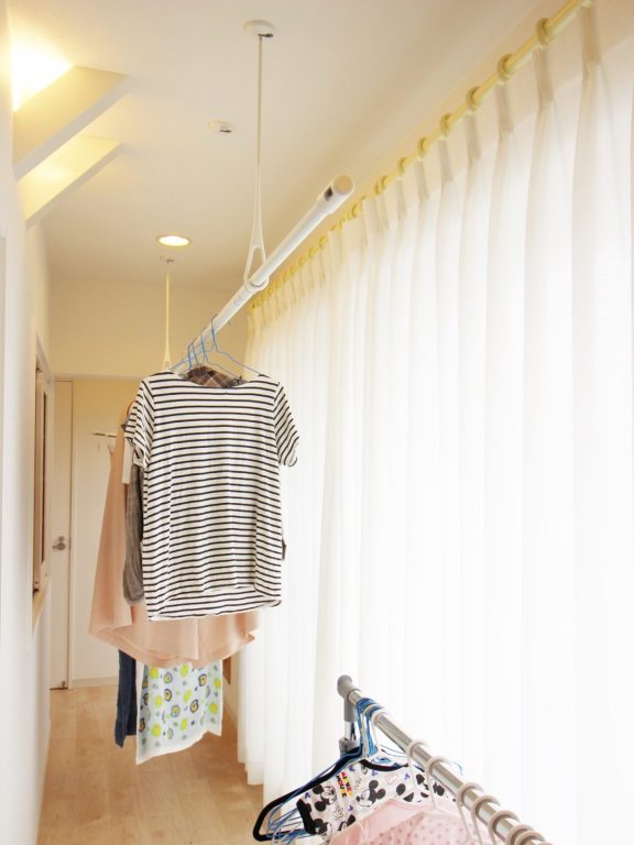 窓際の廊下部分に物干しバーを設置。