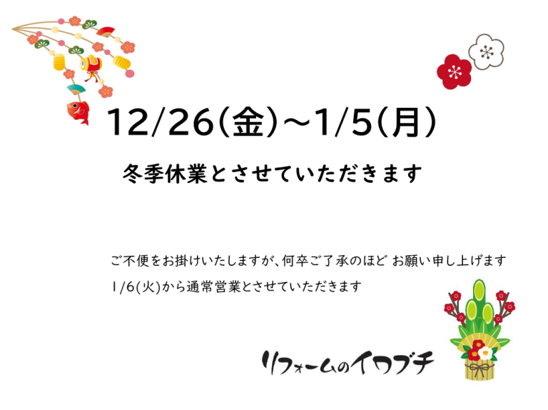 トピックスでもご案内しておりますが、改めて冬季休業のお知らせです。